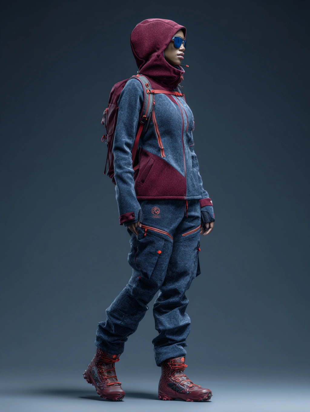 提示词(Prompt) 冬季户外徒步,女士加厚运动夹克与抓绒裤,藏青与暗红色,功能性运动风格,夹克口袋与袖口设计细致,冬日阳光与雪地光影交错,服饰设计效果图 --ar 3:4 |
