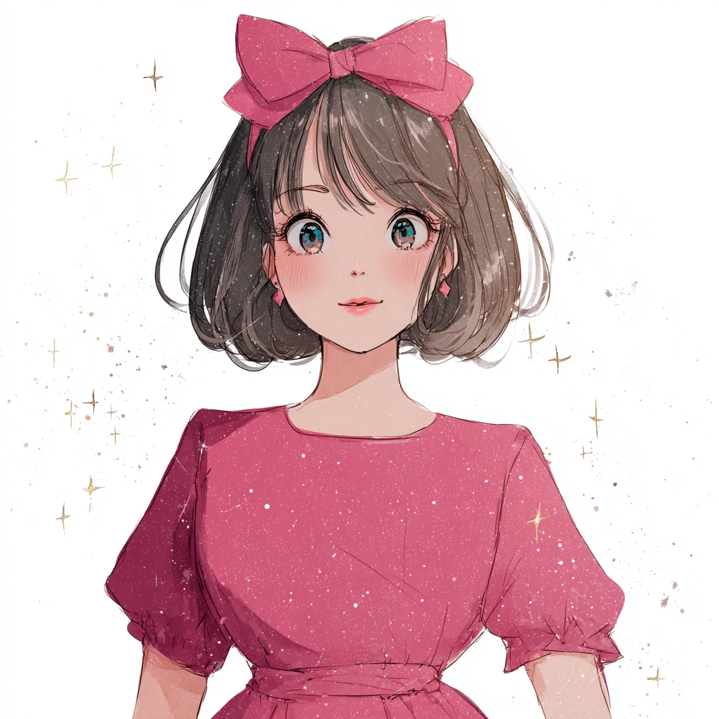 提示词(Prompt) 正面Q版女孩IP形象,短发配蝴蝶结,明亮粉色连衣裙,白色背景,眼睛闪烁星光,脸颊有腮红细节,五官比例可爱,整体色彩鲜艳 |
