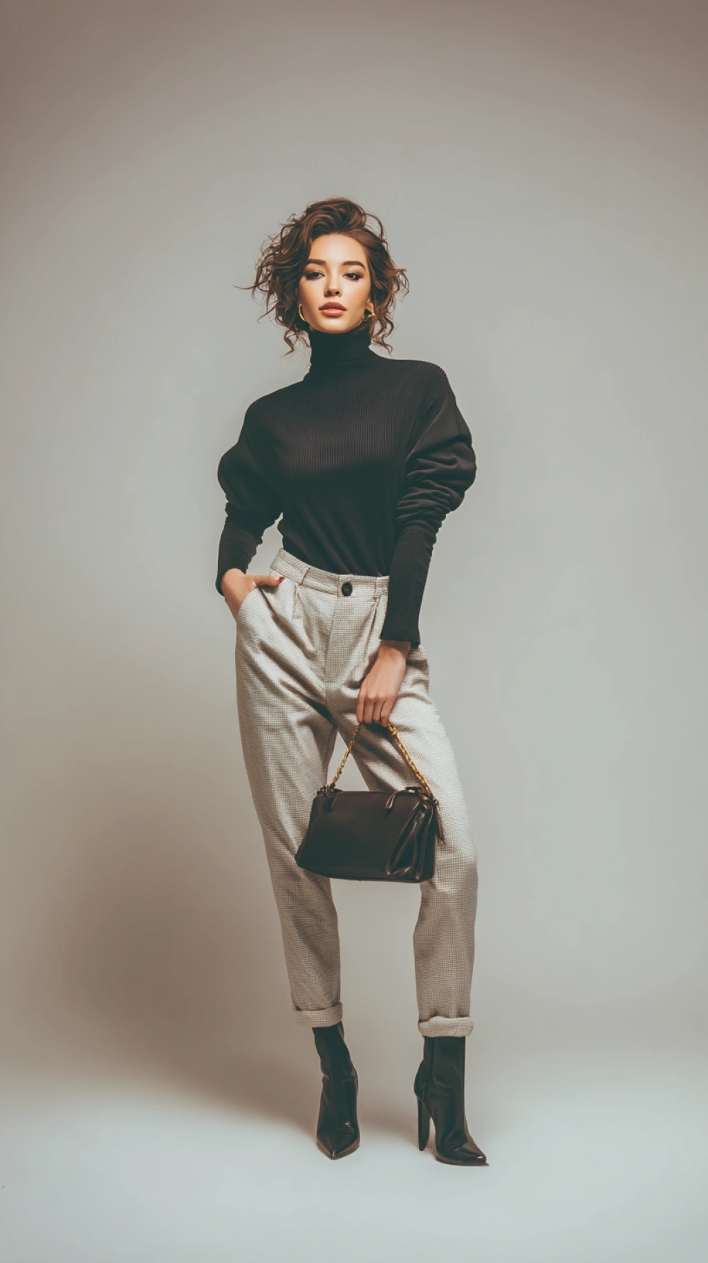 提示词(Prompt) 女时装模特站立,一手拿着时尚手袋,穿着极简主义服装,双臂可见,全身,中性背景,现代时尚拍摄 --ar 9:16 |