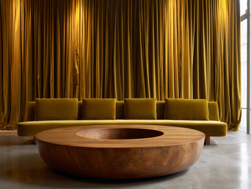 提示词(Prompt) 图片底部中间放置了一个大的木制空底座。背景为橄榄色沙发和暖色调窗帘,极简主义和现代美学,注重优雅的设计和光滑的质感 --c 20 --ar 4:3 |
