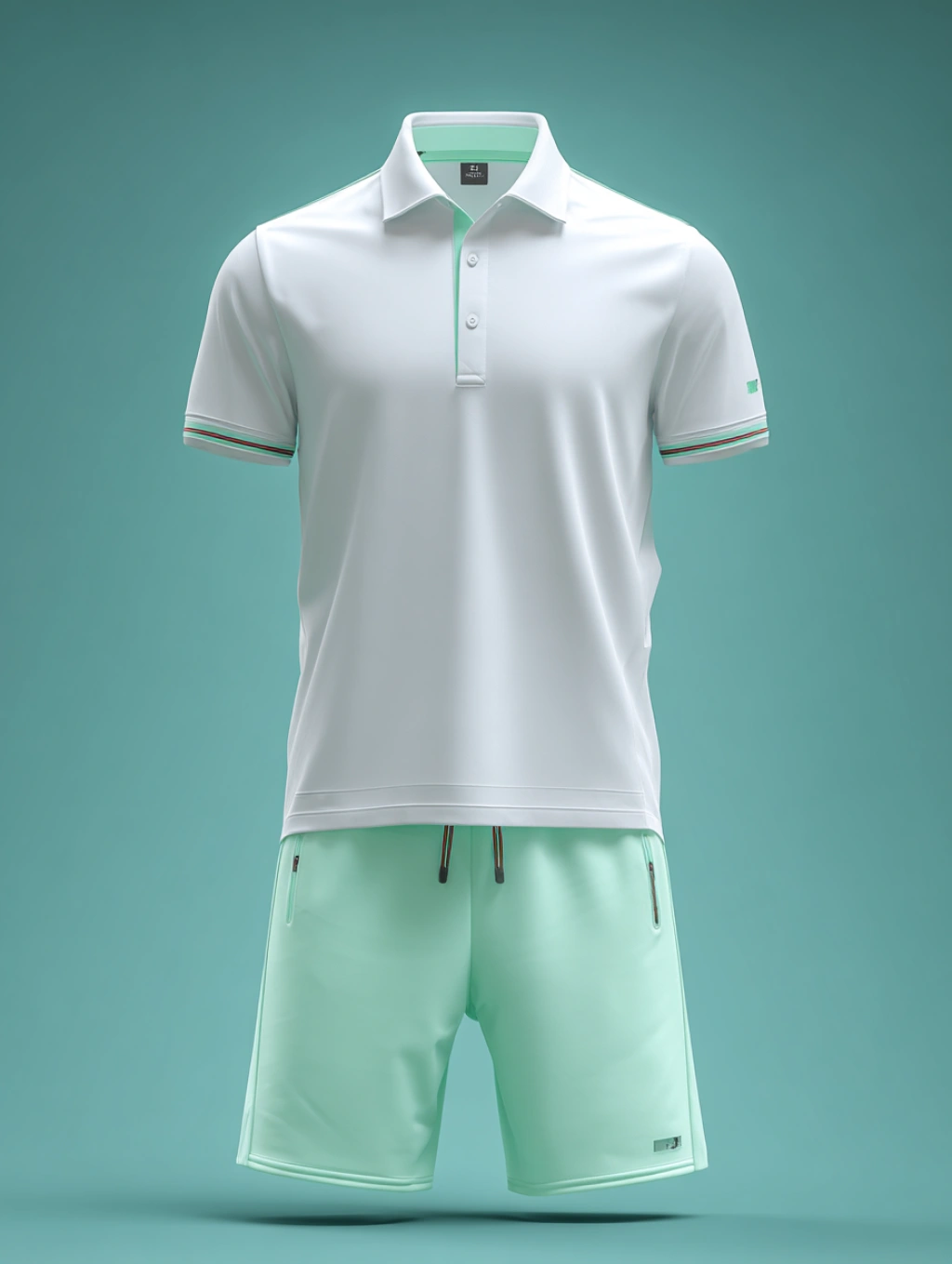 提示词(Prompt) 春季网球训练,男士白色运动Polo搭配浅绿短裤,清新配色,经典运动风格,Polo领口与袖口细节突出,晨曦下衣物明亮,服饰设计效果图 --ar 3:4 |