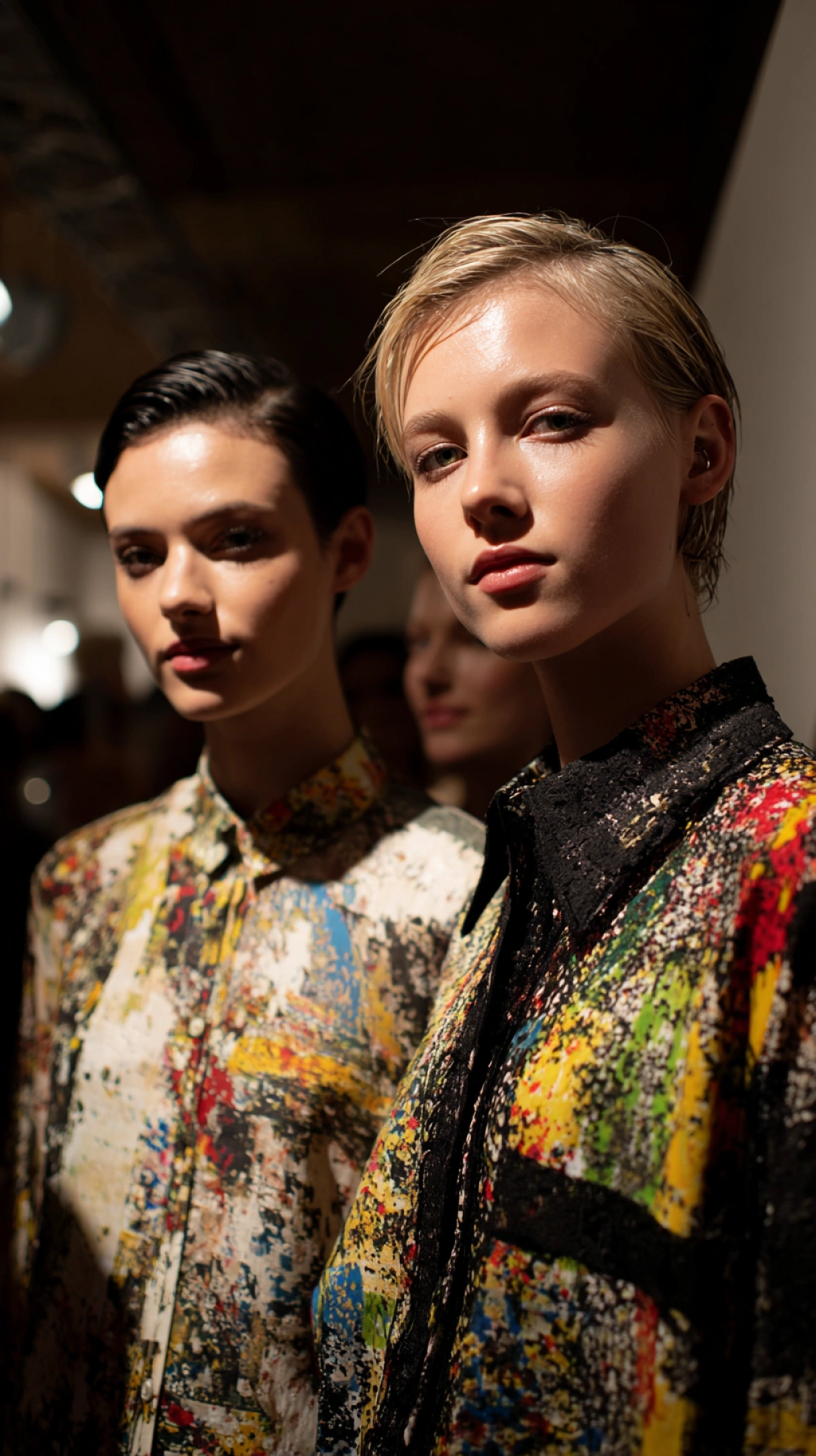 提示词(Prompt) 时尚秀场后台,女模特身穿个性印花衬衫,彩色与黑色混搭,先锋潮流风格,印花图案细腻,后台灯光斑驳照射 --ar 9:16 |