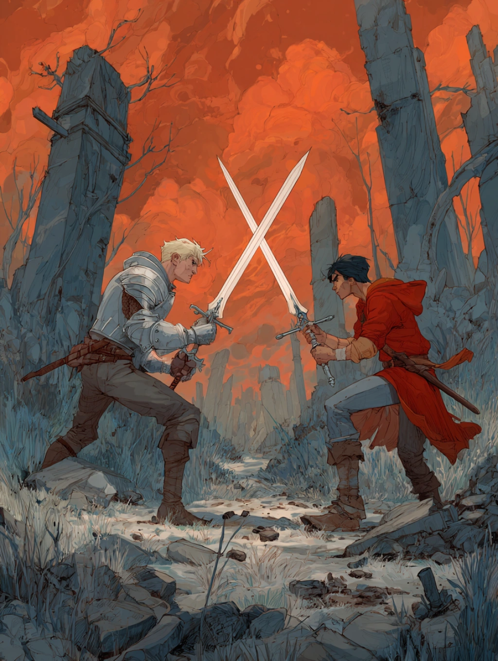 提示词(Prompt) 二次元骑士决斗,少年持剑与敌对峙,银灰与赤红,热血冒险风格,剑刃有光效,晨曦洒落战场,画面紧张激烈 --ar 3:4 |