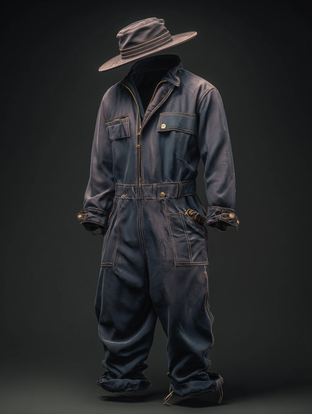 提示词(Prompt) 秋季车间维修,男士连体工装与帽子,藏蓝与灰色调,实用工装风格,工装拉链与袖口设计,车间灯光映射衣物层次,服饰设计效果图 --ar 3:4 |