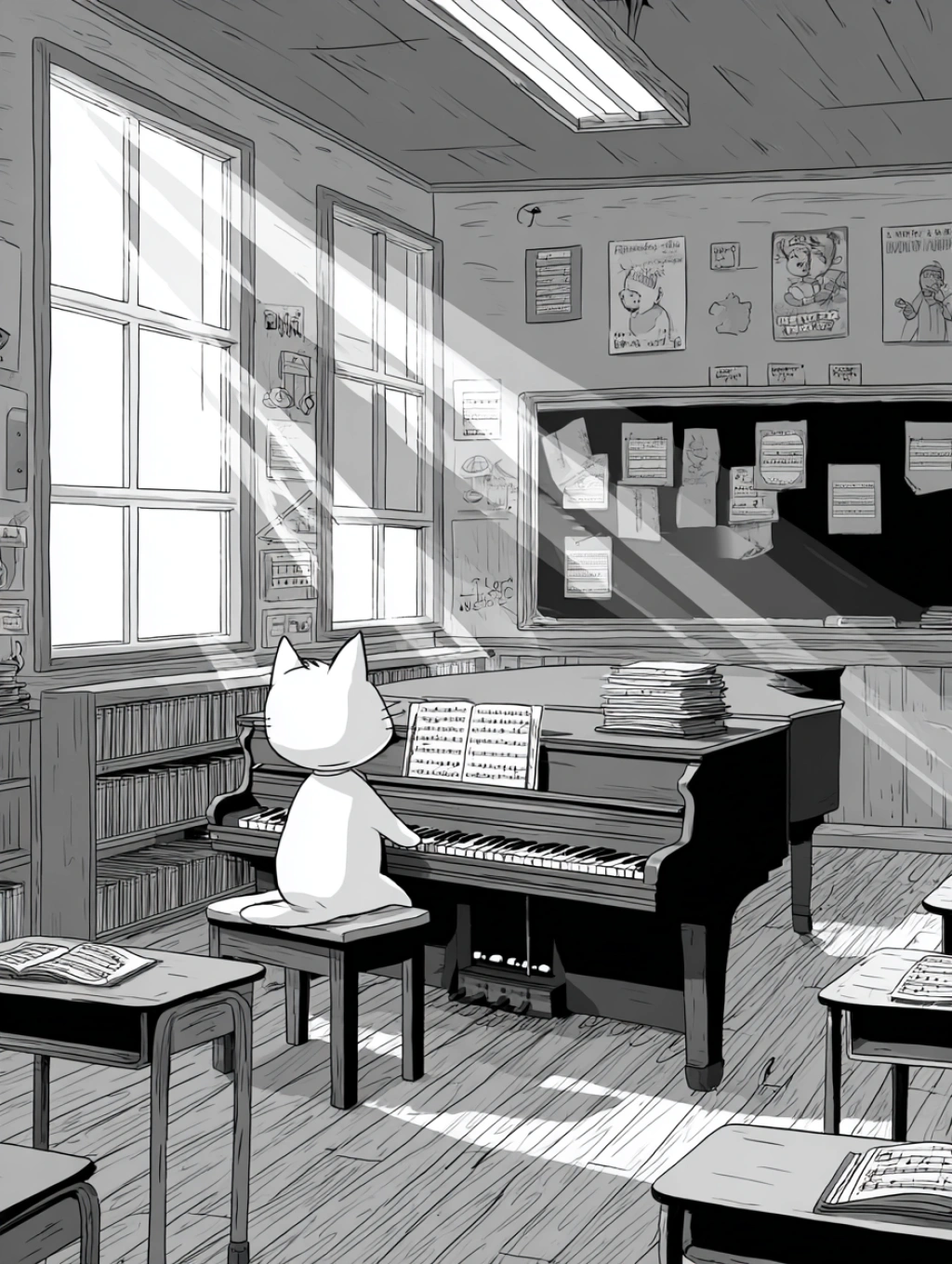 提示词(Prompt) 卡通音乐教室,猫咪老师弹奏钢琴,米白与蓝色,音乐童趣风格,黑白琴键细节,教室窗外明亮阳光,画面温馨欢乐 --ar 3:4 |
