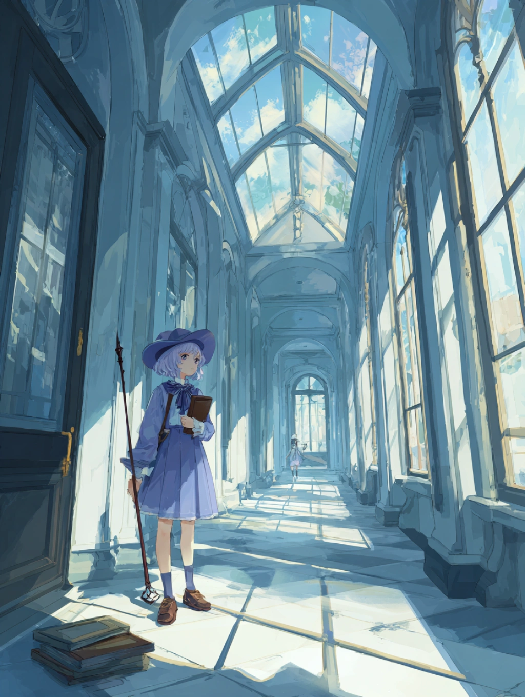 提示词(Prompt) 魔法学园走廊里的动漫少女,手持魔杖与书本,薰衣草紫与天蓝色,校园魔幻风格,制服领结精致,窗外阳光洒落地板,氛围梦幻温柔 --ar 3:4 |