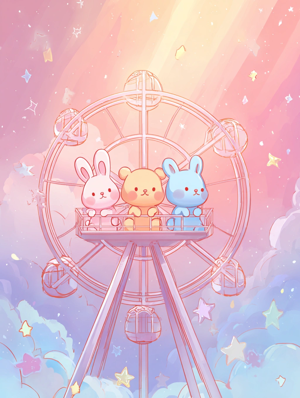 提示词(Prompt) 卡通动物游乐园,兔子与小熊一起坐摩天轮,粉蓝与橙色,童趣卡通风格,摩天轮有星星装饰,黄昏余晖下色彩温暖,画面治愈动人 --ar 3:4 |