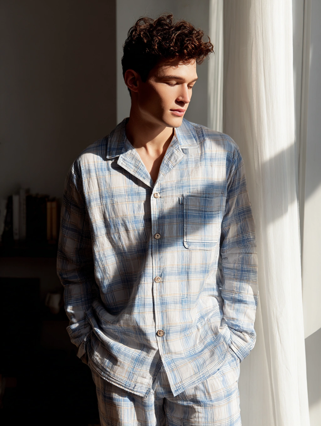 春季周末早晨,男士棉质长袖睡衣配格纹睡裤,浅蓝与白色调,舒适家居风格,睡衣纽扣与口袋细节,窗外晨光柔和照射,服饰设计效果图 --ar 3:4