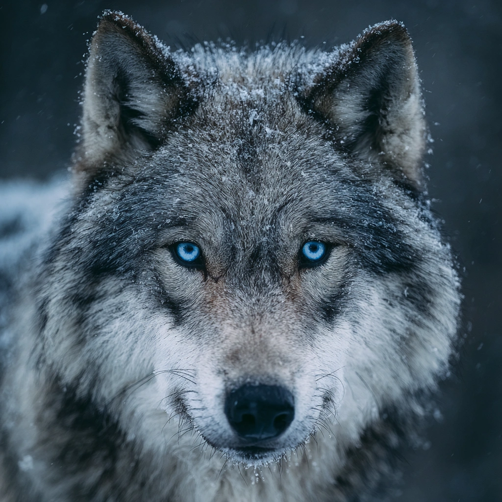 提示词(Prompt) 冬季雪林,灰狼凝视镜头,银灰毛发与冰蓝瞳孔,高清野性特写摄影风格,鼻尖有雪花残留,侧光勾勒狼的轮廓,氛围冷峻神秘 |