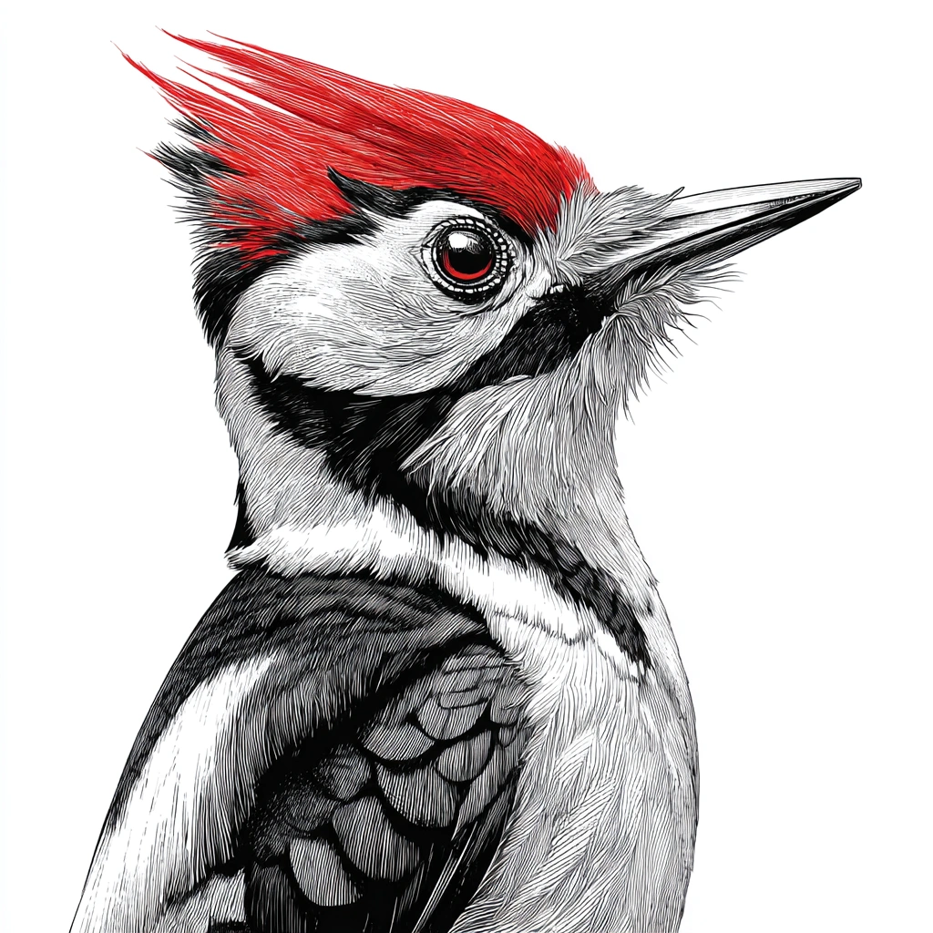 提示词(Prompt) 白色背景,正面卡通啄木鸟IP形象,黑白羽毛配红色头顶,细长尖嘴,眼睛有高光,翅膀层层分明,表情机灵鲜艳 |