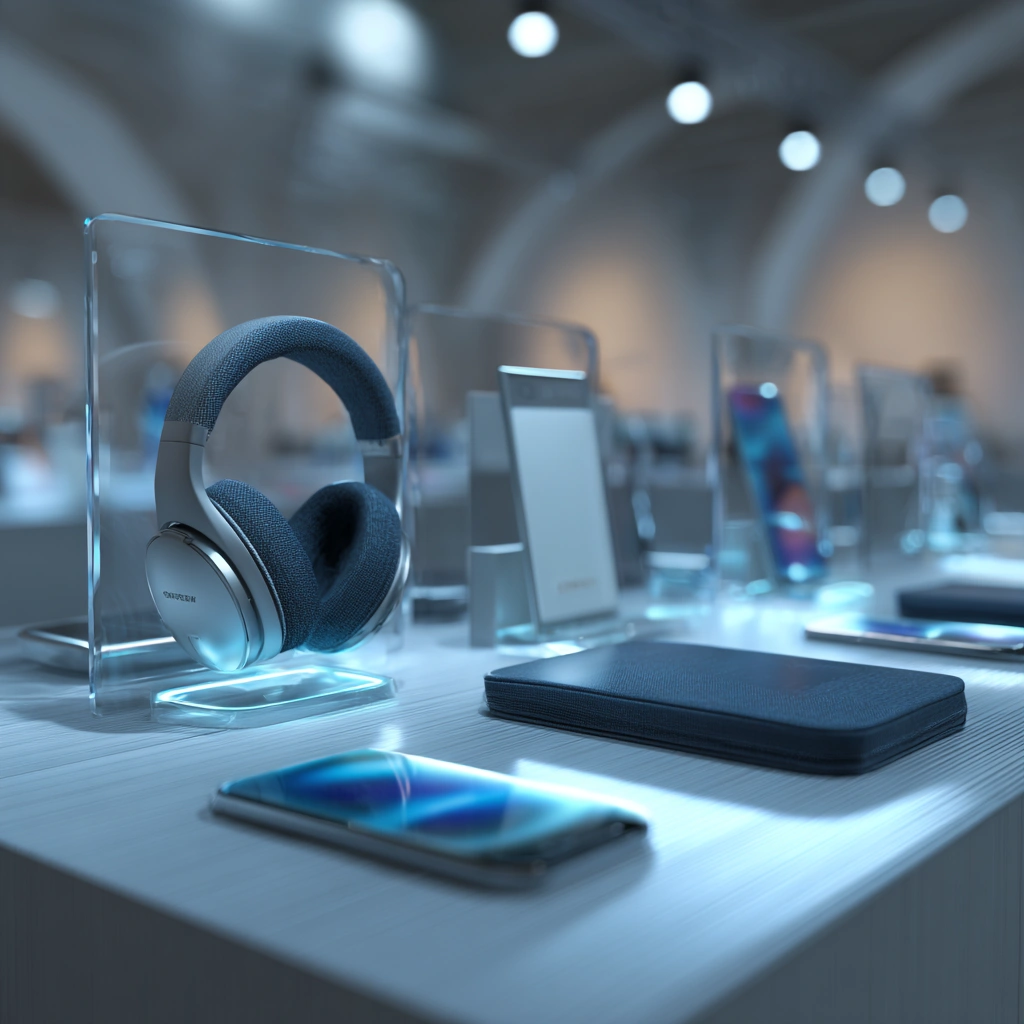电子产品展区,智能手机与蓝牙耳机并列,银灰与深蓝色彩,未来科技风格,机身弧线和屏幕高光细节,环境光线冷暖交错,画面科技感十足
