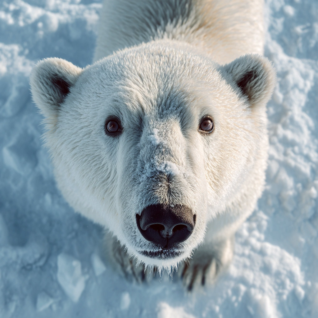 提示词(Prompt) 雪地中央,北极熊凝视镜头,纯白厚重毛发与黑色鼻尖,高清自然特写摄影风格,毛发层次分明,冰面反射冷光,眼神透出温柔与力量 |