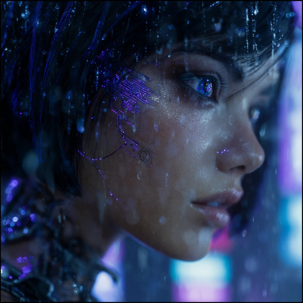 提示词(Prompt) 赛博朋克夜景:年轻东方女性,单侧脸部植入细致发光神经电路,虹膜微光,短发带少量金属发束,紫蓝霓虹反射在脸部水汽,皮肤质感真实,雨夜雾气与全息广告 |