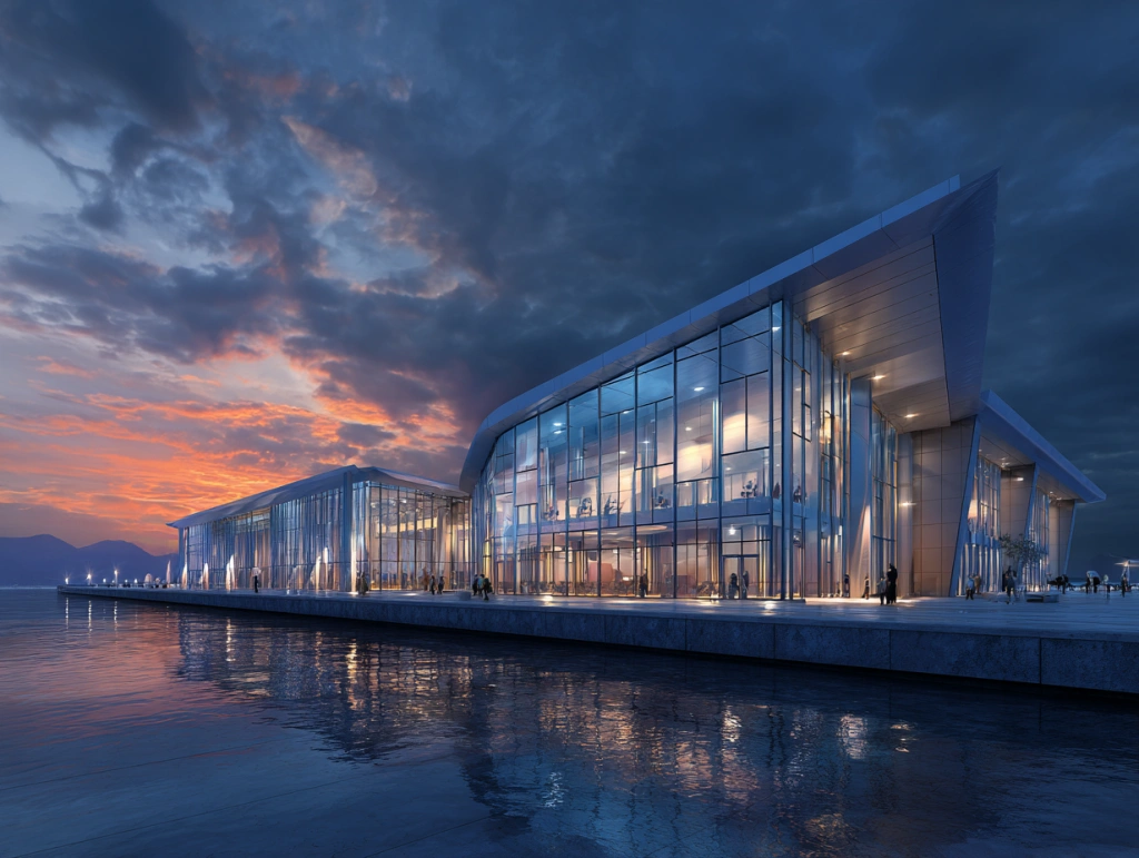 提示词(Prompt) 港口客运大楼,大片玻璃窗和远眺海景,深蓝与银白色调,现代港口风格,船只停泊和大厅布局丰富,夕阳余晖洒落,氛围开阔,建筑设计效果图 --ar 4:3 |