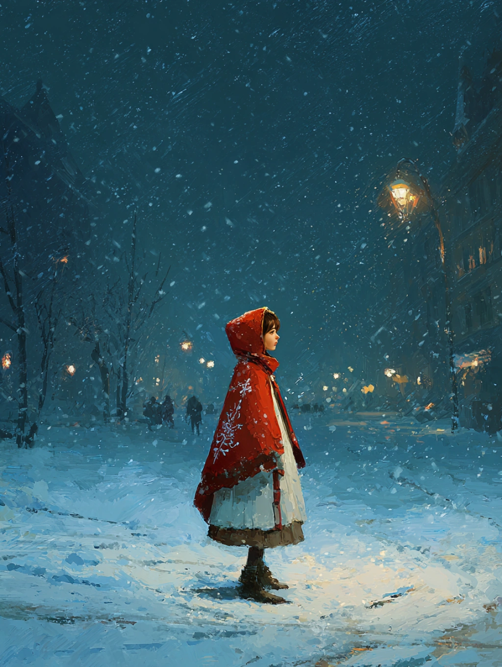 提示词(Prompt) 二次元雪夜街头,少女身披红色斗篷,雪白与猩红,冬日幻想风格,斗篷上有雪花刺绣,路灯光晕映照雪地,氛围温柔静谧 --ar 3:4 |