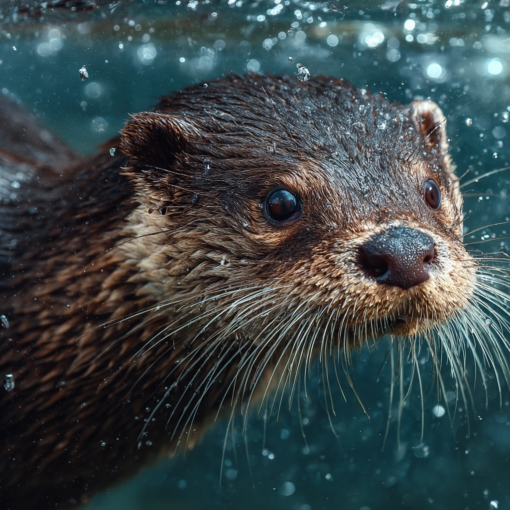 提示词(Prompt) 清澈溪流,水獭仰头戏水特写,深褐湿润皮毛与晶莹水珠,高清自然特写摄影风格,胡须纤细,阳光反射水面,画面活泼可爱 |