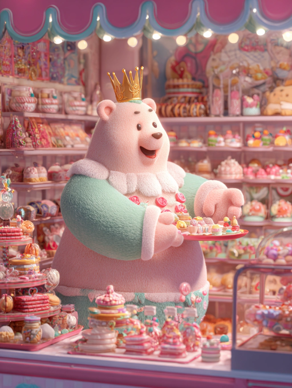 提示词(Prompt) 卡通糖果王国,小熊国王分发糖果,粉红与薄荷绿,童话可爱风格,糖果造型多样,室内暖光映射甜品,画面甜美欢快 --ar 3:4 |