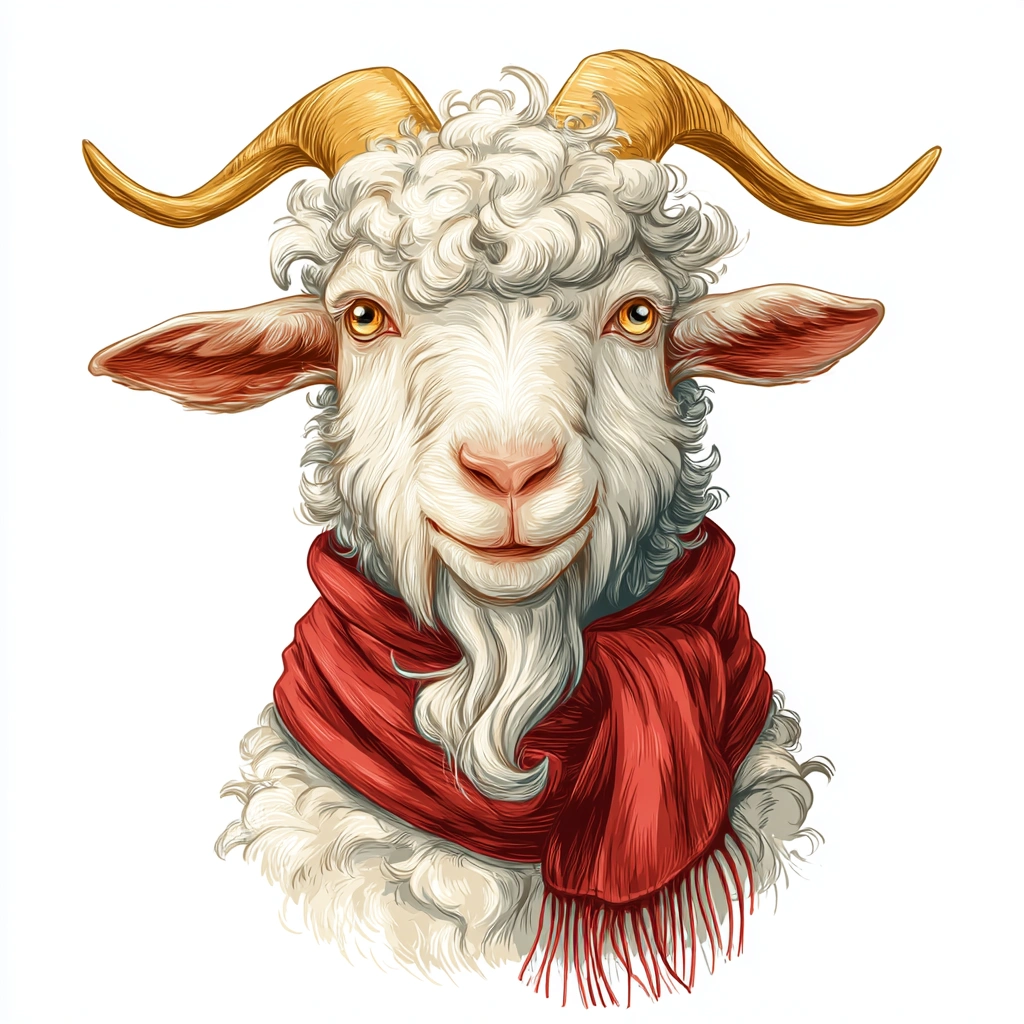 提示词(Prompt) 白色背景,正面卡通山羊IP形象,白色卷毛,金色小角,穿红色围巾,胡须弯曲,眼睛大而温柔,整体色彩明快 |