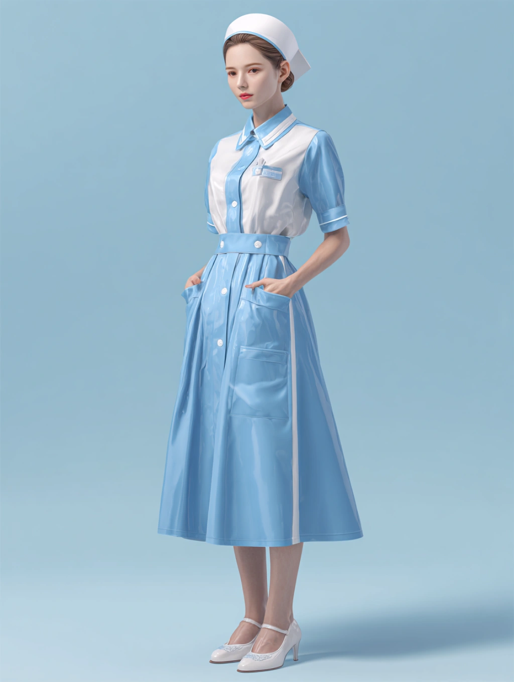 提示词(Prompt) 夏季医院护理,女士轻薄护士服与小白鞋,淡蓝与白色调,专业工装风格,护士服口袋与纽扣细节,明亮灯光下衣物干净清爽,服饰设计效果图 --ar 3:4 |
