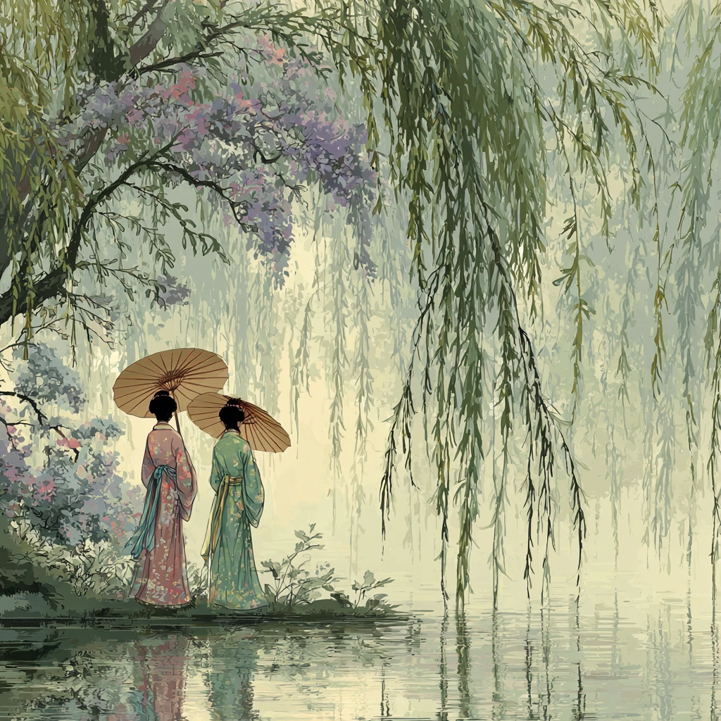 提示词(Prompt) 古风湖畔手绘,仕女撑伞漫步柳岸,湖面与垂柳飘逸,青灰与淡紫色调,国风手绘风格,衣褶与柳丝细致描绘,微风与水光交错 |