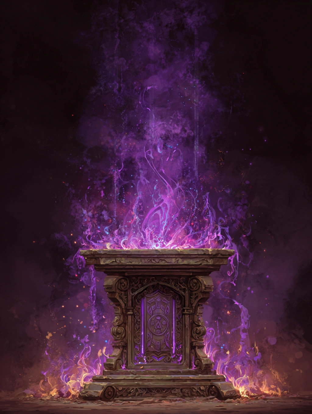 提示词(Prompt) 游戏魔法祭坛,巫师召唤元素精灵,紫色与金色,奇幻神秘风格,祭坛有符文雕刻,火焰与魔法光效交错,氛围神秘强烈 --ar 3:4 |