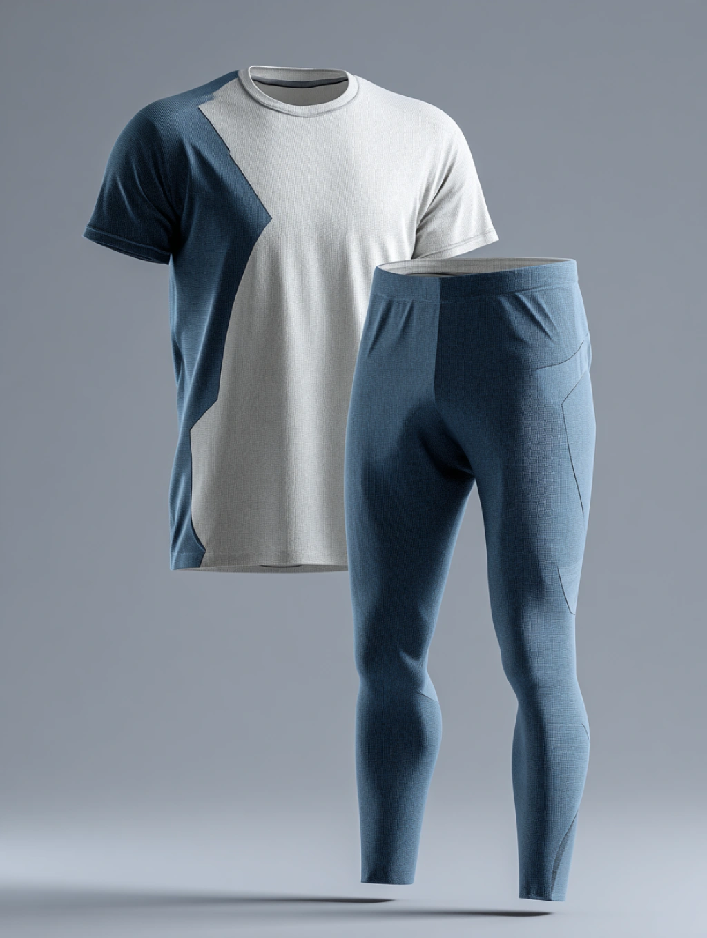 提示词(Prompt) 春季瑜伽课,男士贴身运动T恤与弹力裤,浅灰与墨蓝色,极简运动风格,T恤拼接线条流畅,室内早晨柔光映照衣物,服饰设计效果图 --ar 3:4 |