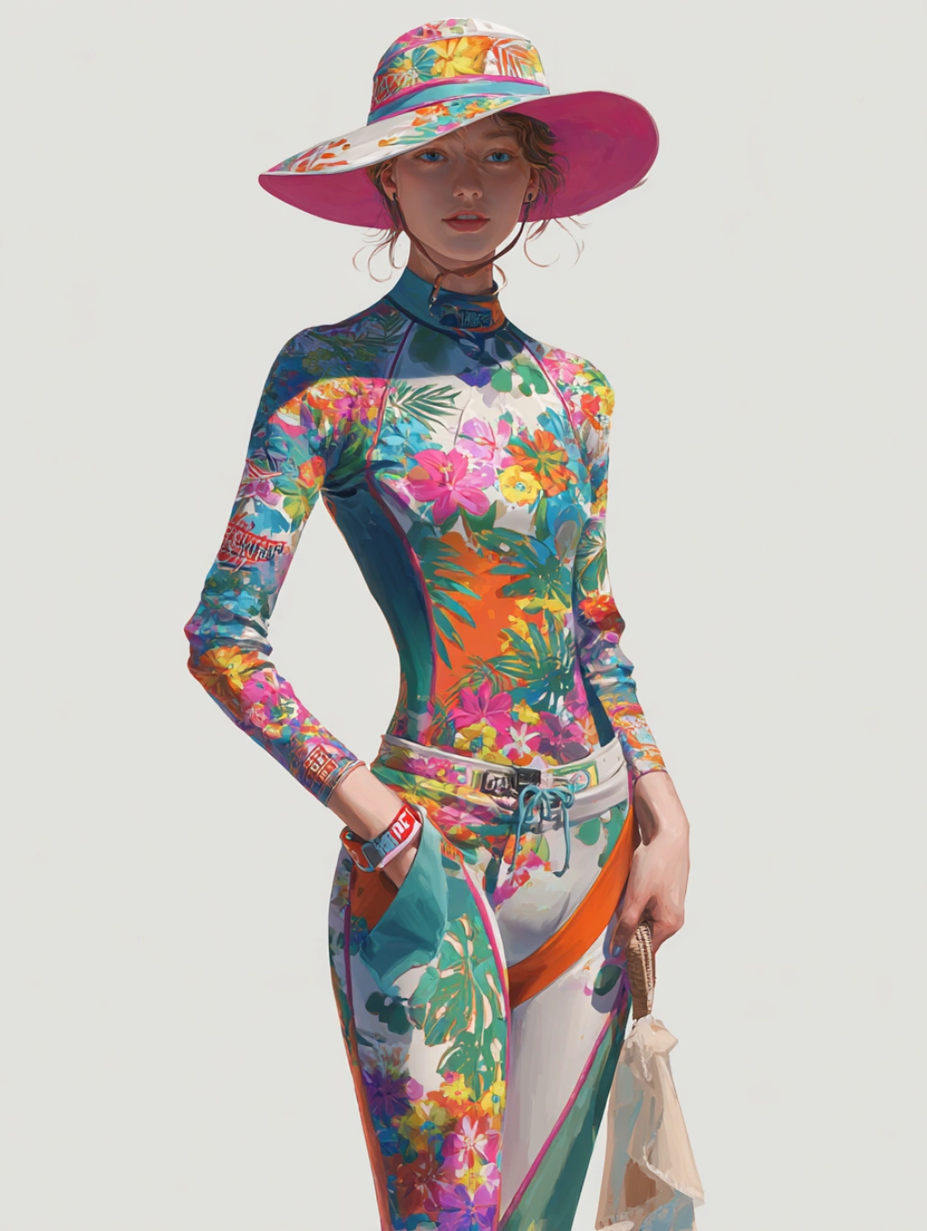 提示词(Prompt) 夏季冲浪海滩,女士印花冲浪服与沙滩帽,鲜艳色彩,热带运动风格,冲浪服拼色与防晒细节,烈日下衣物光泽闪耀,服饰设计效果图 --ar 3:4 |
