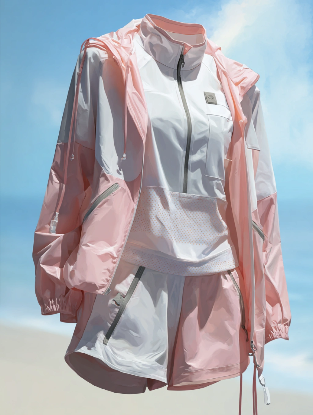 提示词(Prompt) 夏季沙滩徒步,女士防晒外套与速干短裤,浅粉与白色调,休闲户外风格,外套透气网眼与拉链细节,阳光下衣物轻盈,服饰设计效果图 --ar 3:4 |