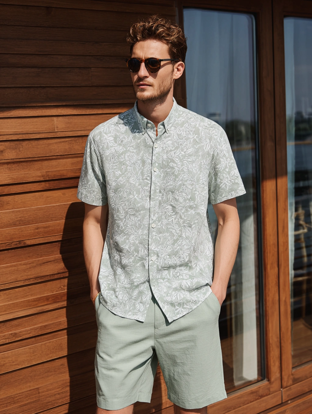 提示词(Prompt) 春季阳台晒太阳,男士轻薄家居短袖搭配棉质短裤,浅绿与白色,休闲舒适风格,短袖印花细节,阳光映射衣物柔软质地,服饰设计效果图 --ar 3:4 |
