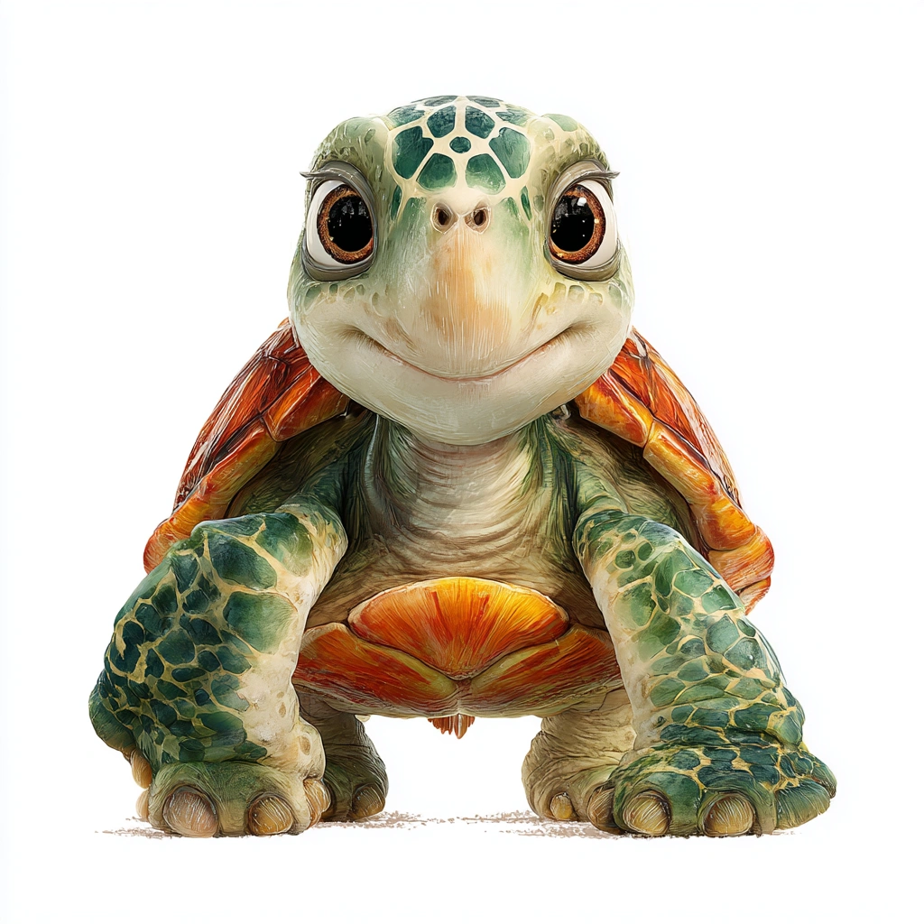 提示词(Prompt) 白色背景,正面卡通乌龟IP形象,绿色壳配橙色花纹,脚掌圆润,眼睛大而温和,嘴巴微笑,壳上有细致纹理 |
