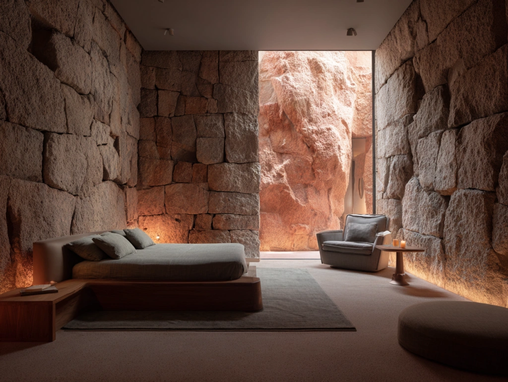 石头风格 卧室, 中间空着,周边摆放几件简约的家具, 营造出温馨舒适的氛围。 --ar 4:3
