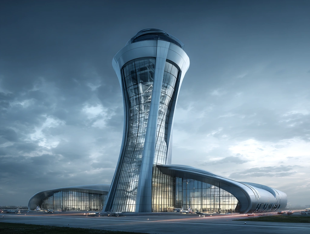 提示词(Prompt) 飞机场塔台,现代高耸造型与玻璃金属结构,银白与深蓝色调,科技感强烈,雷达设备和外墙细节丰富,清晨微光映照,环境专业,建筑设计效果图 --ar 4:3 |