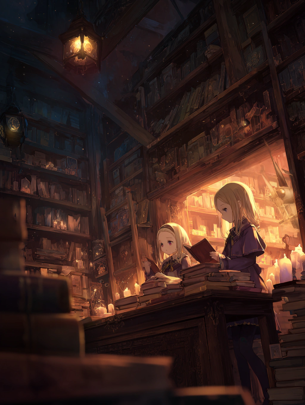 提示词(Prompt) 动漫魔法书屋,少女翻阅古籍,深棕与紫色,魔法幻想风格,书页有符文光效,烛光映照书架,氛围神秘温暖 --ar 3:4 |