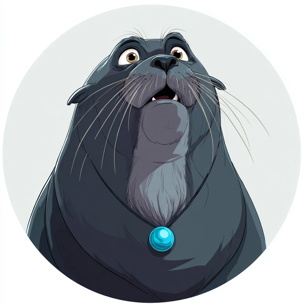 提示词(Prompt) 白色背景,正面卡通海狮IP形象,深灰皮肤,胡须清晰,嘴巴微微张开,眼睛圆润,胸前挂蓝色小球,色彩明亮 |