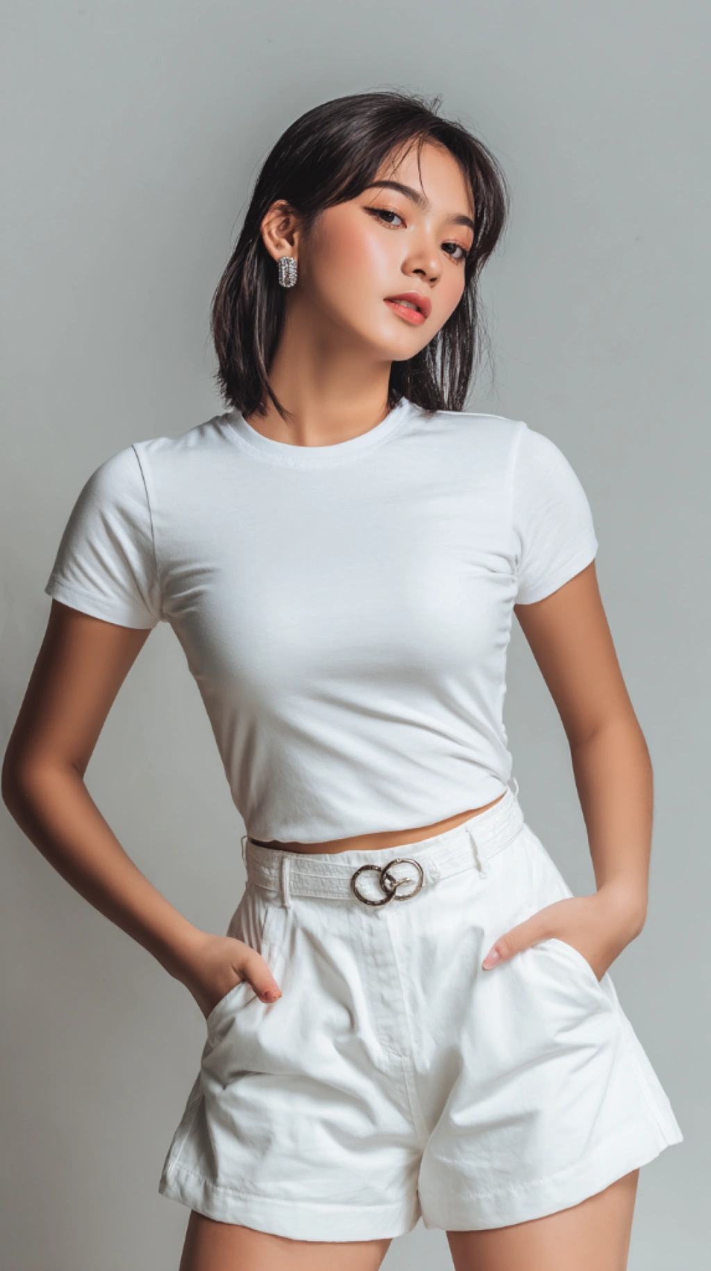 提示词(Prompt) 亚洲 女时装模特站立,穿着纯白短T恤和白色短裤,姿势休闲,双手在外面放松,中性灰色背景,全身丰满,极简主义工作室灯光 --ar 9:16 --c 20 |