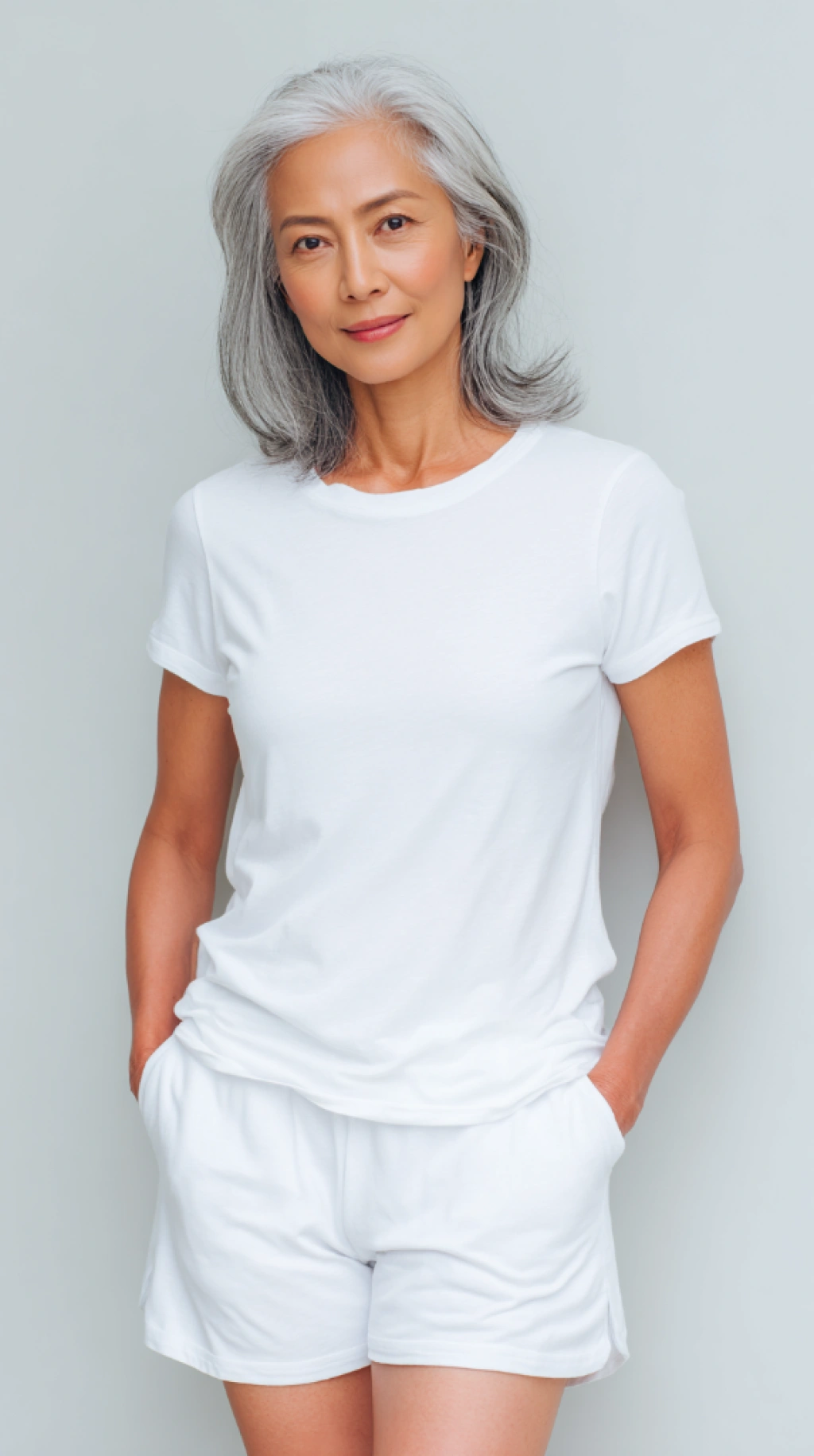提示词(Prompt) 亚洲 70岁的女装模特站立,穿着纯白短T恤和白色短裤,姿势休闲,双手在外面放松,中性灰色背景,全身丰满,极简主义工作室灯光 --ar 9:16 --c 20 |
