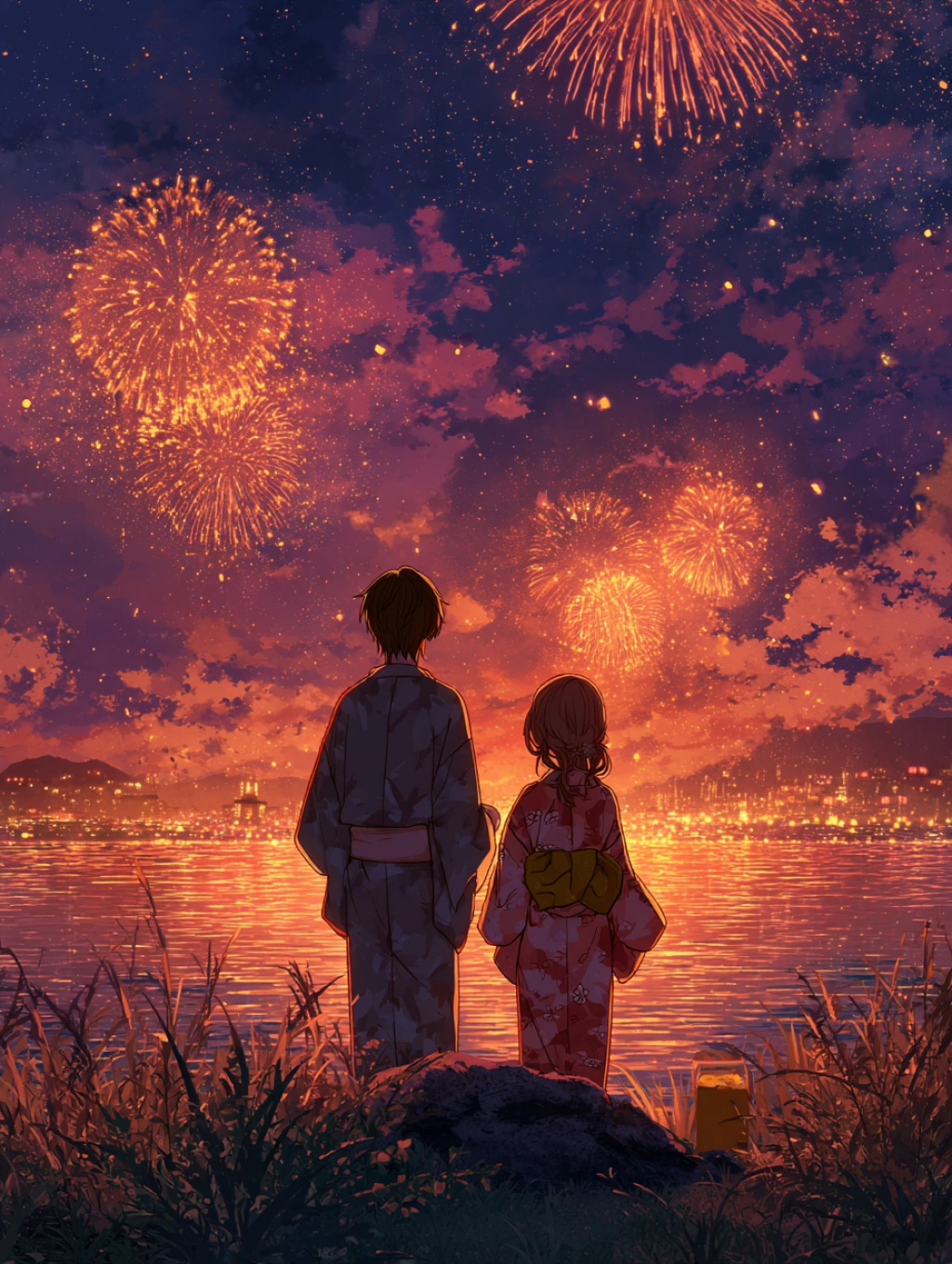 提示词(Prompt) 二次元夜晚花火,少年少女一同仰望烟花,紫色与橙红,浪漫日系风格,烟花绽放层次丰富,夜空光斑点点,画面温馨感动 --ar 3:4 |