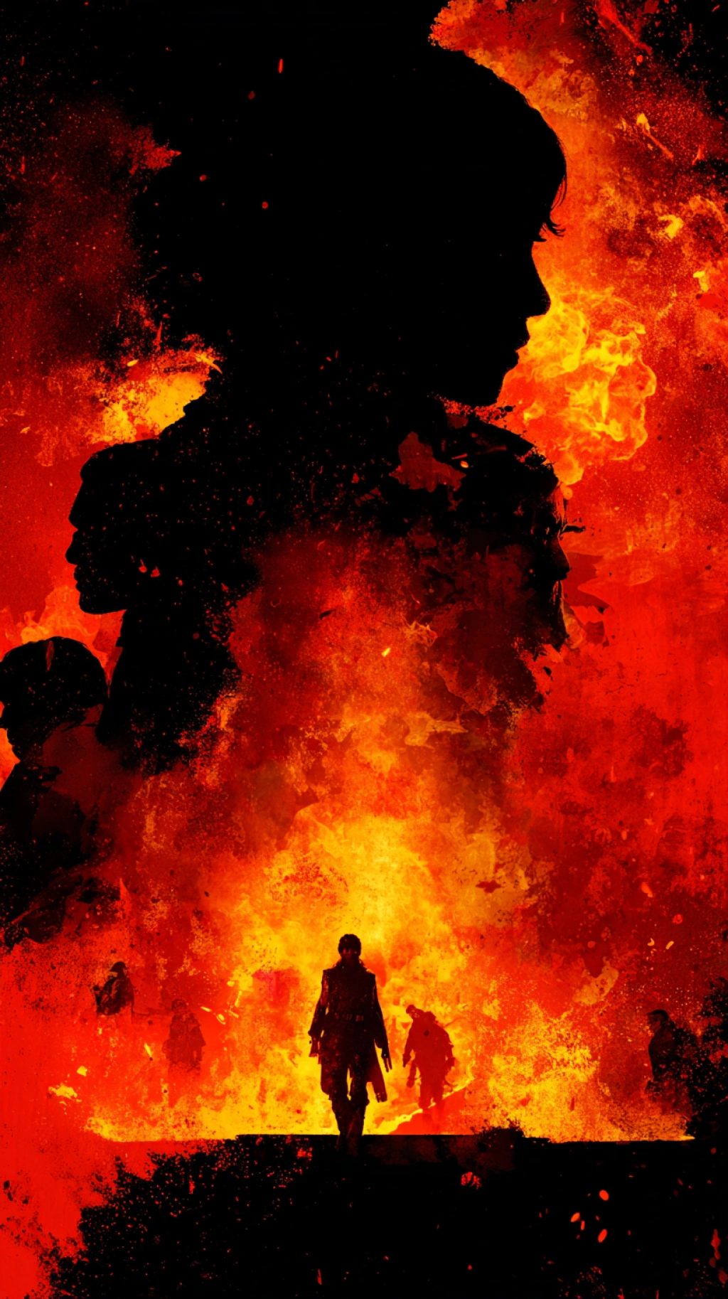 提示词(Prompt) 电影首映海报,主角剪影与爆炸火焰,黑色配红黄色调,激烈动作风格,人物轮廓突出,火光与烟雾营造强烈光影对比,画面紧张震撼 --ar 9:16 |