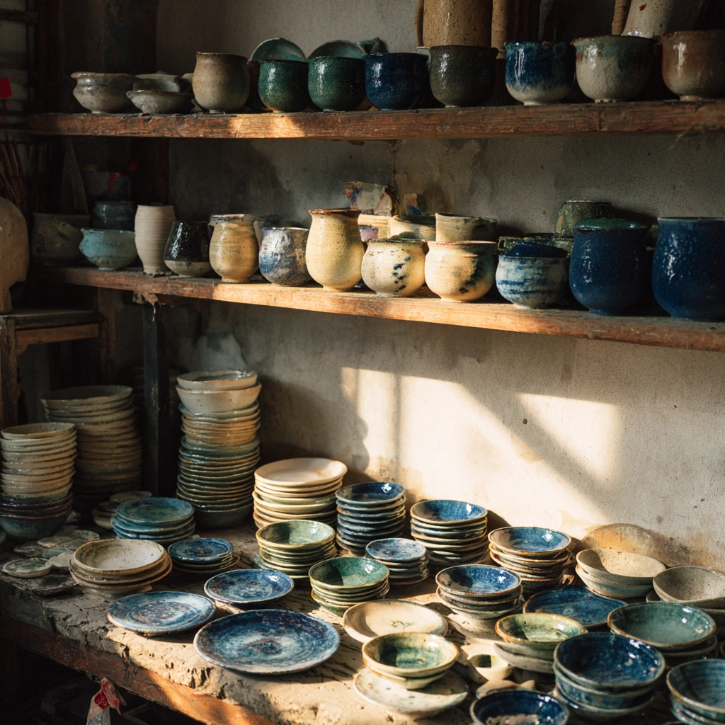 提示词(Prompt) 乡村陶艺工坊,手拉胚陶罐与手绘盘子摆放架上,土黄与湖蓝色调,质朴田园风格,陶器表面釉色变化丰富,手印痕迹自然,晨光斜射温暖氛围 |