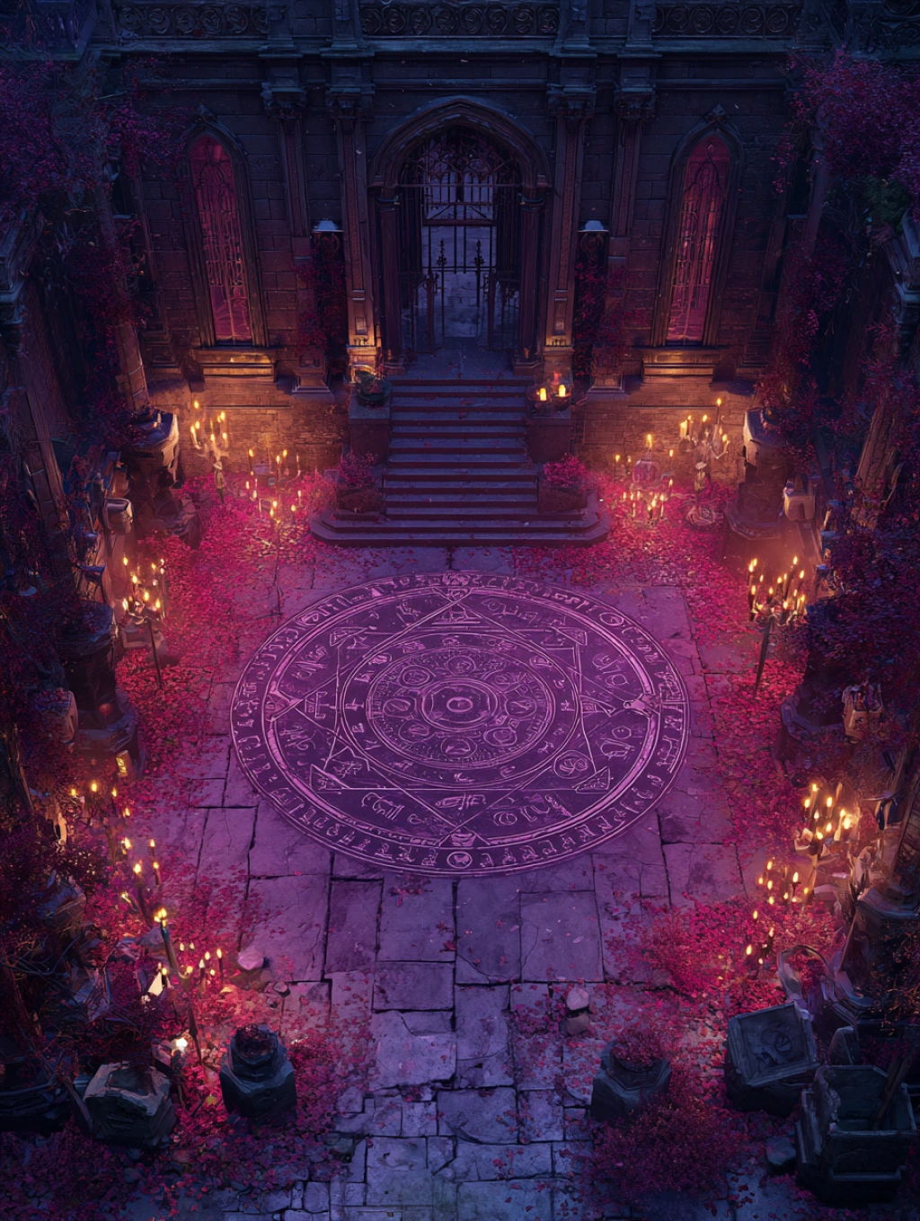 提示词(Prompt) 游戏黑暗城堡,女巫施展魔法阵,深紫与暗红,哥特奇幻风格,魔法阵符号细致,烛光与魔法光效交融,氛围神秘诡异 --ar 3:4 |