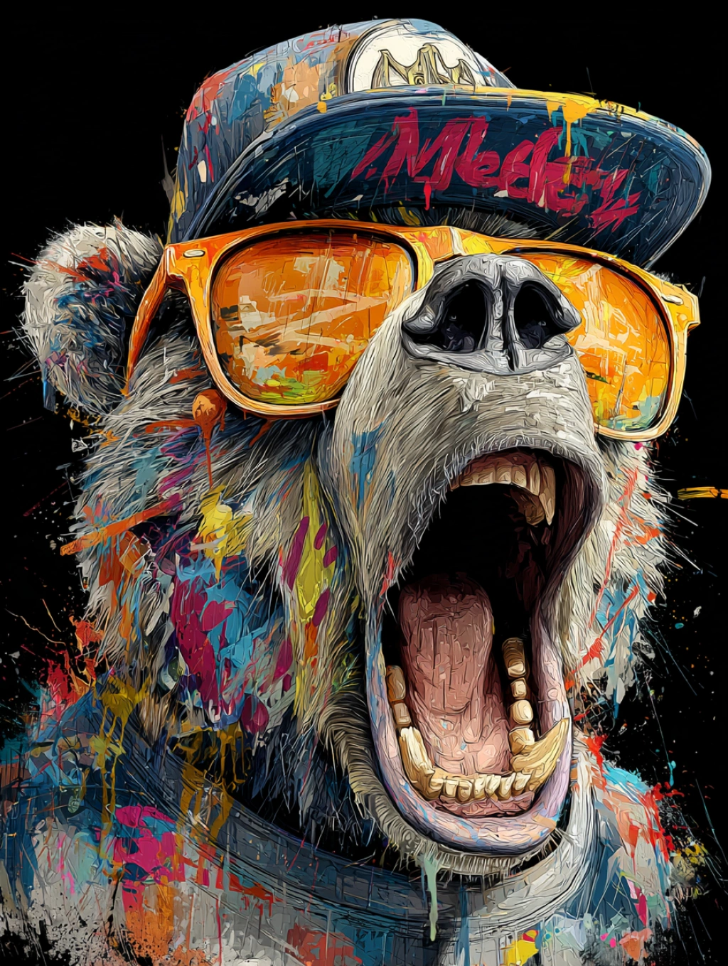 提示词(Prompt) 潮流涂鸦风格,熊,夸张表情,五彩斑斓,棒球帽,墨镜,街头文化,酷帅有趣,时尚感强烈,IP形象 --ar 3:4 |