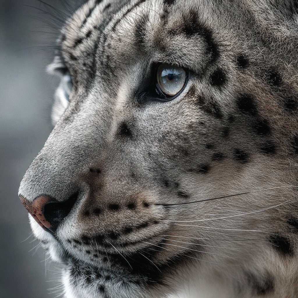 提示词(Prompt) 高山雪岩,雪豹侧脸特写,灰白毛发与深色豹斑,高清野生动物特写风格,毛发与斑点细腻,清晨冷光勾勒轮廓,氛围冷静壮美 |