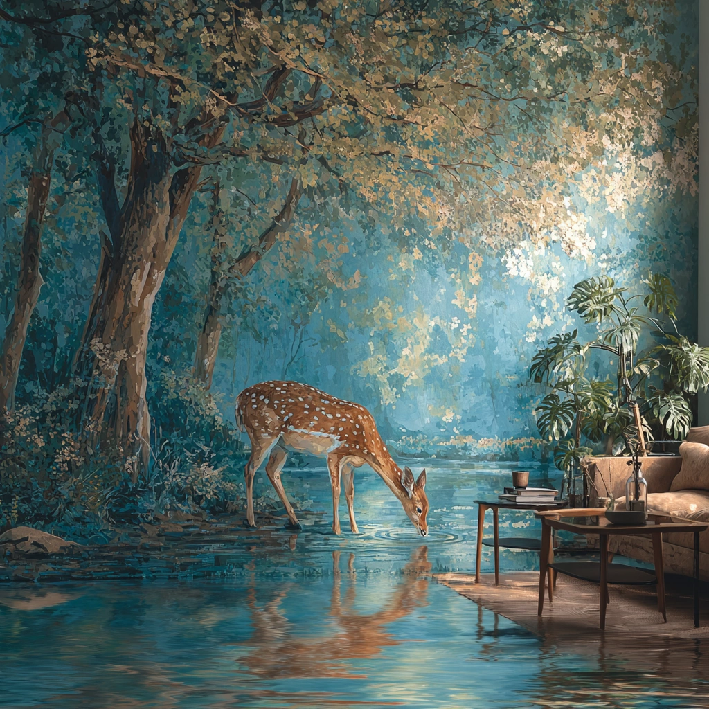 提示词(Prompt) 森林溪流手绘,鹿群在水边饮水,翠绿与湖蓝色彩,自然写意手绘风格,鹿身斑点细致,树叶倒影水面,晨光穿透林间形成斑驳光影 |