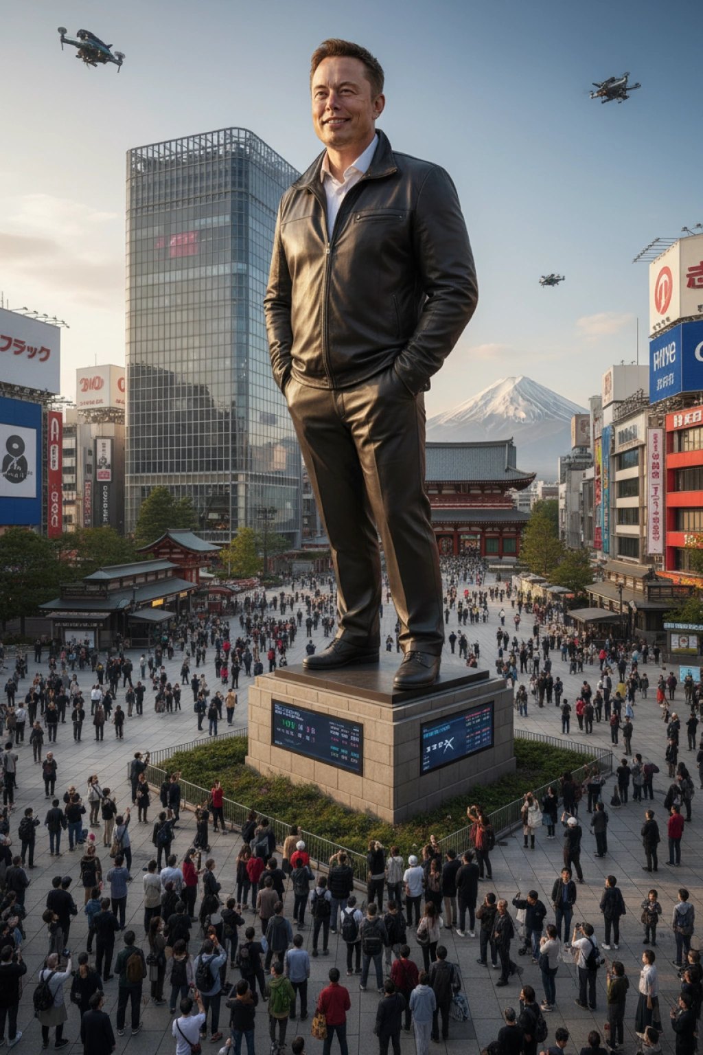 提示词(Prompt) 一幅写实的摄影作品。这个人的巨型雕像被安放在东京市中心的广场上,人们仰望着它。 使用的图片 ![]() |