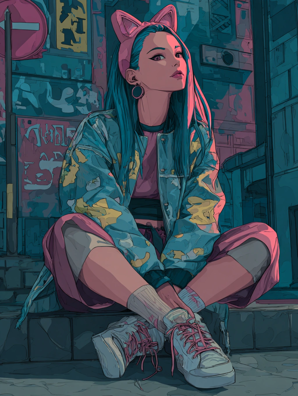 提示词(Prompt) 卡通城市街头的猫耳少年,斑斓路牌与霓虹灯,蓝紫色调,欧美卡通风格,牛仔外套上有涂鸦图案,夜晚灯光映射发丝,画面活泼动感 --ar 3:4 |