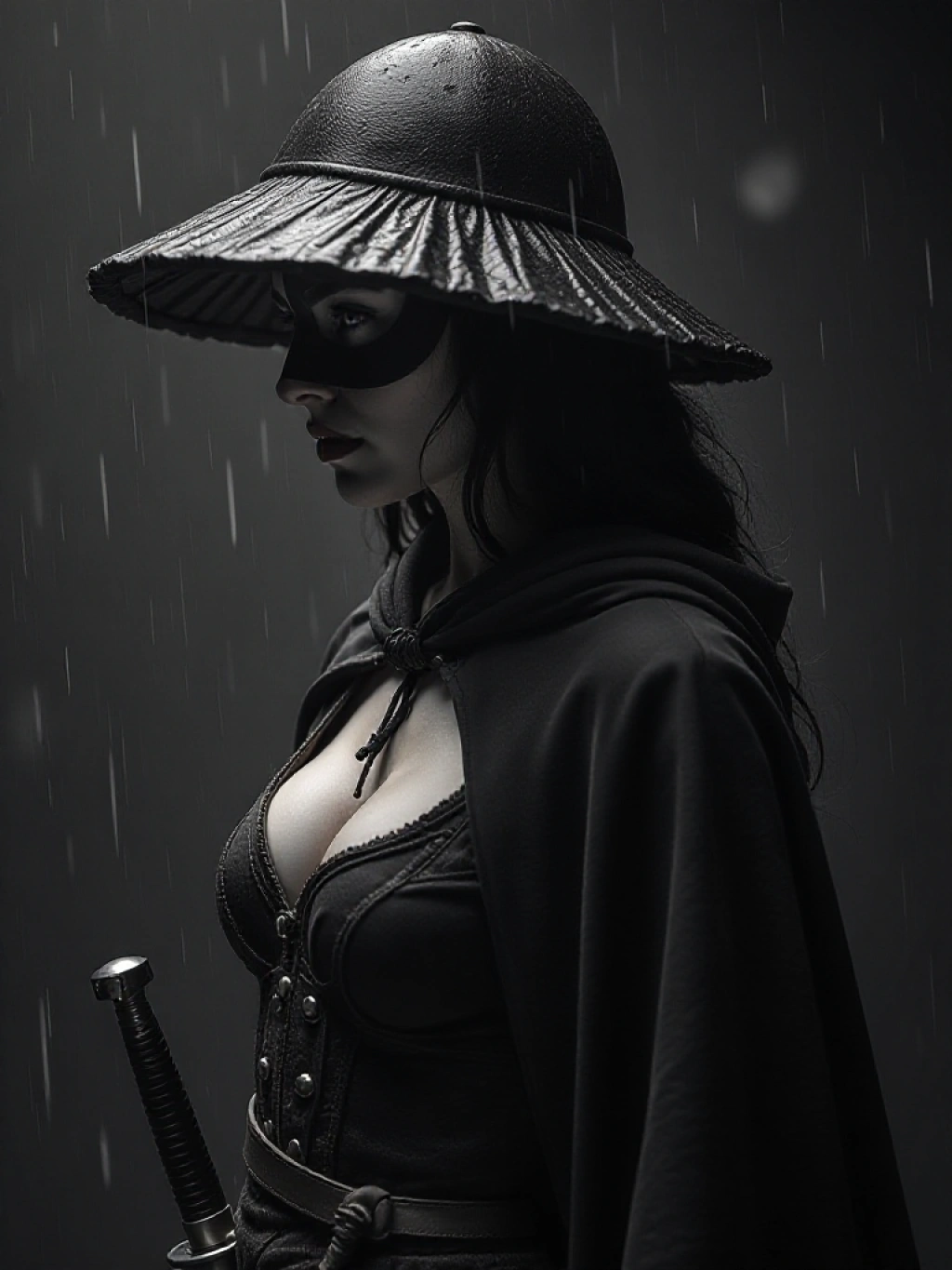 提示词(Prompt) 2300年代蒙面英雄,面容悲伤,从侧面看,自然的小乳房,下垂的乳房,斗篷,松软的帽子,手放在她的剑套上,在雨中,一小股水流从她的脸上流下来,对比度高,风格坦率。高对比度、整个图像中突出的纹理效果、高对比度灯光创造戏剧性的阴影、颗粒状的电影般的纹理 --ar 3:4 |