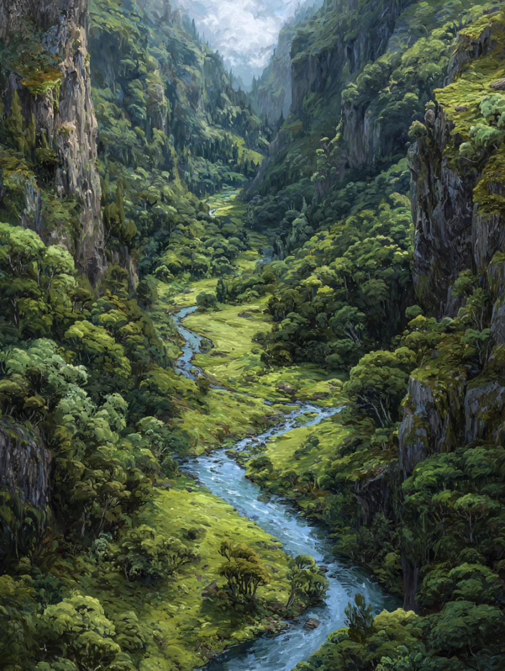 提示词(Prompt) 郁郁葱葱的河谷,蜿蜒的溪流,茂密的树叶,陡峭的悬崖,原始的荒野 --ar 3:4 |