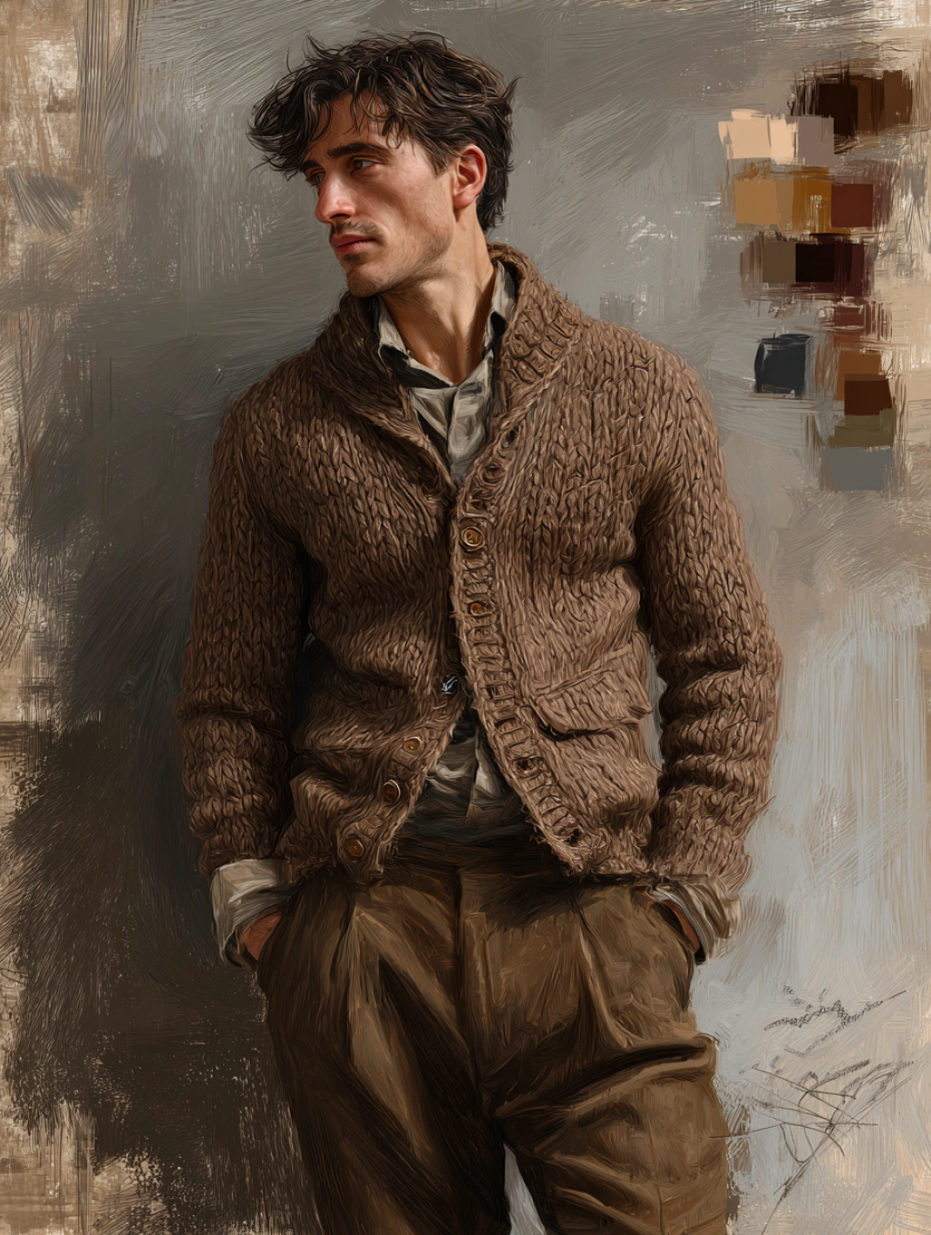 提示词(Prompt) 秋季图书馆学习,男士针织开衫与棕色长裤,温暖色系,文艺休闲风格,开衫纽扣与袖口线细致,午后柔光映射衣物纹理,服饰设计效果图 --ar 3:4 |