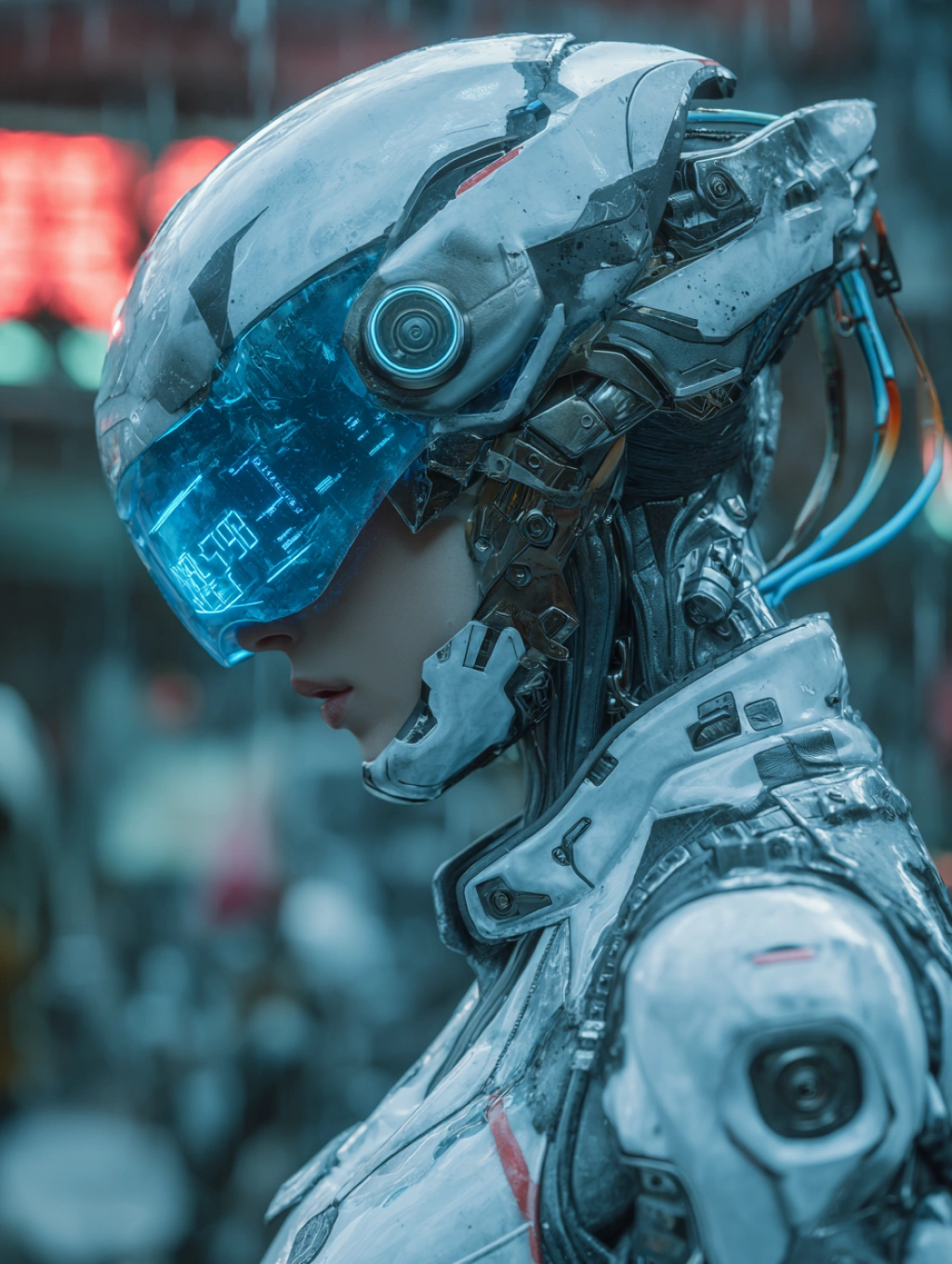 提示词(Prompt) 游戏场景中的机械少女,机械臂与未来头盔,银灰与电光蓝,赛博朋克风格,装备有数字显示屏,城市霓虹灯光反射金属,画面酷炫科技 --ar 3:4 |