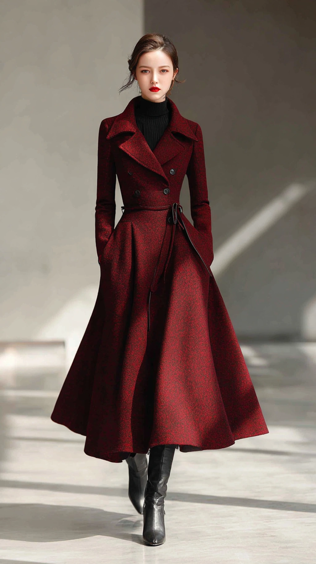 提示词(Prompt) 冬季商务宴请,女士酒红色毛呢外套加黑色长靴,深色调突出,沉稳优雅风格,外套下摆厚实,室内暖灯光反射细腻光影,服饰设计效果图 --ar 9:16 |